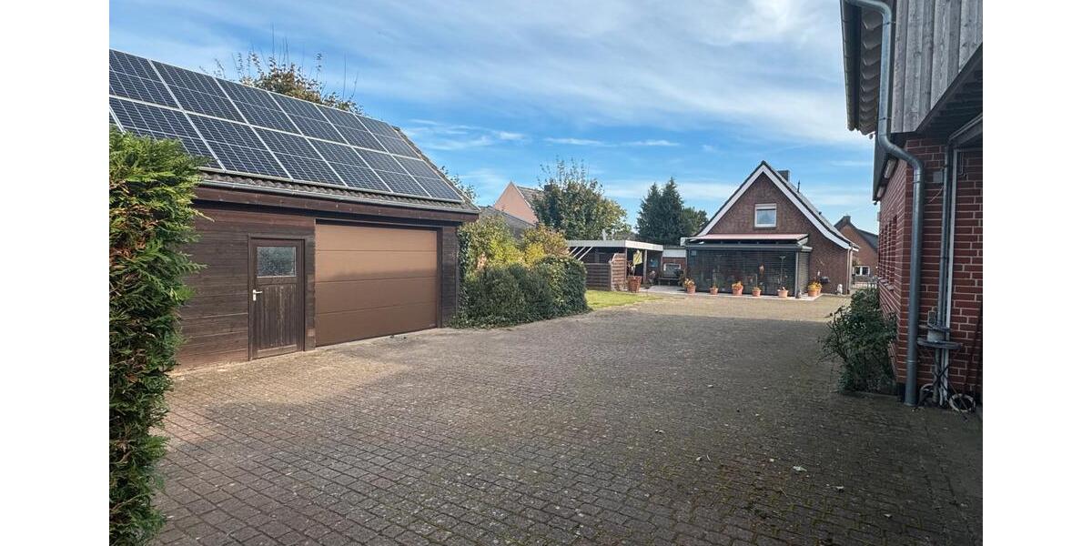 Außenanlagen • Carport mit zwei Stellplätzen • Garage mit elektrischem Hörmann-Tor, Fahrradschuppen und großem Dachboden als Stauraum • Großes, gepflegtes Grundstück mit Gartenbereich • Große Hofauffahrt mit elektrischem Tor