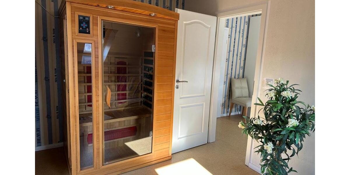Im Obergeschoss liegen drei Schlafräume und ein helles Badezimmer. Des Weiteren befindet sich hier ein kleiner Wellnessraum mit Wärmekabine.